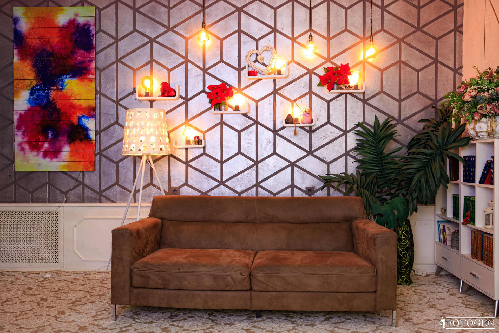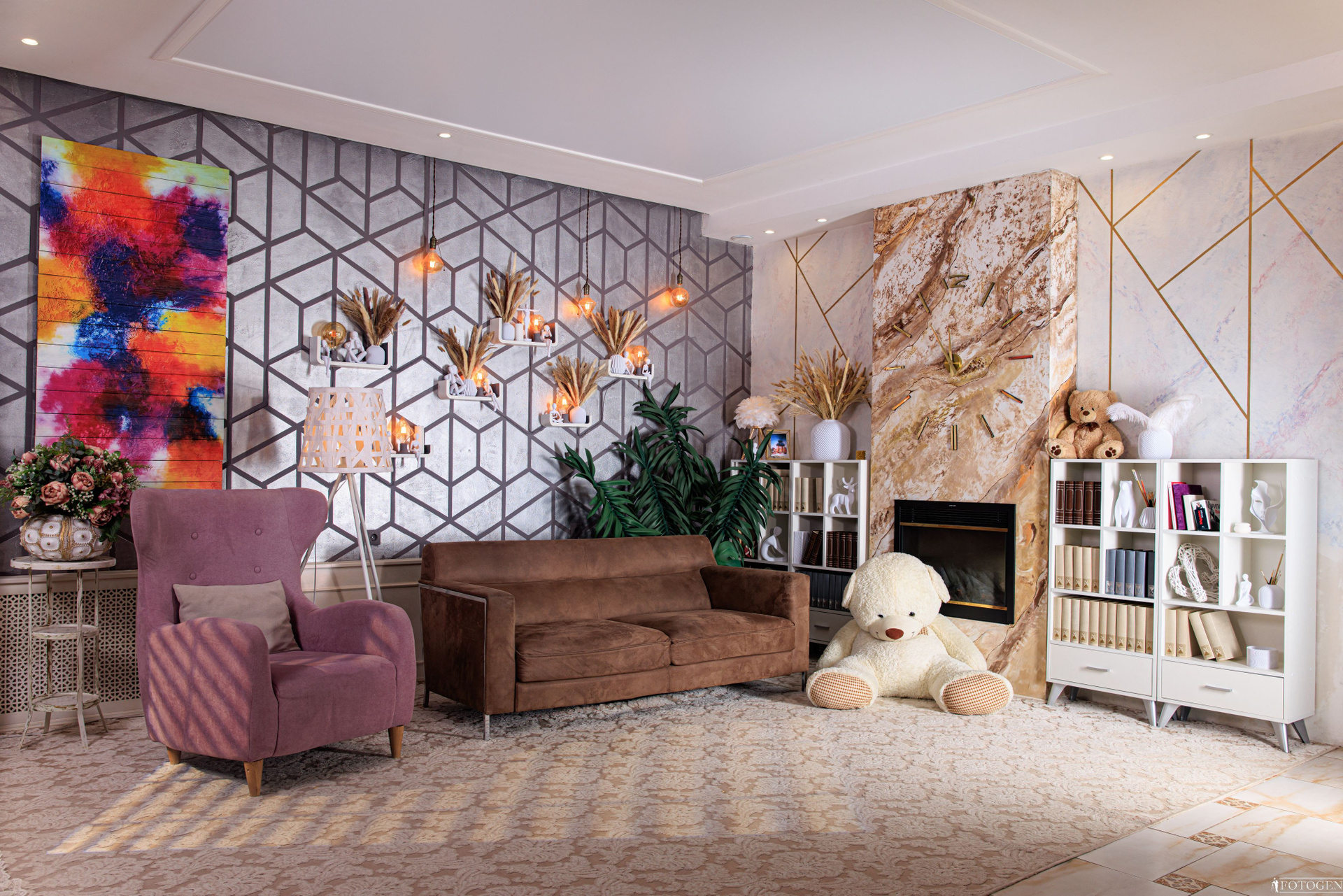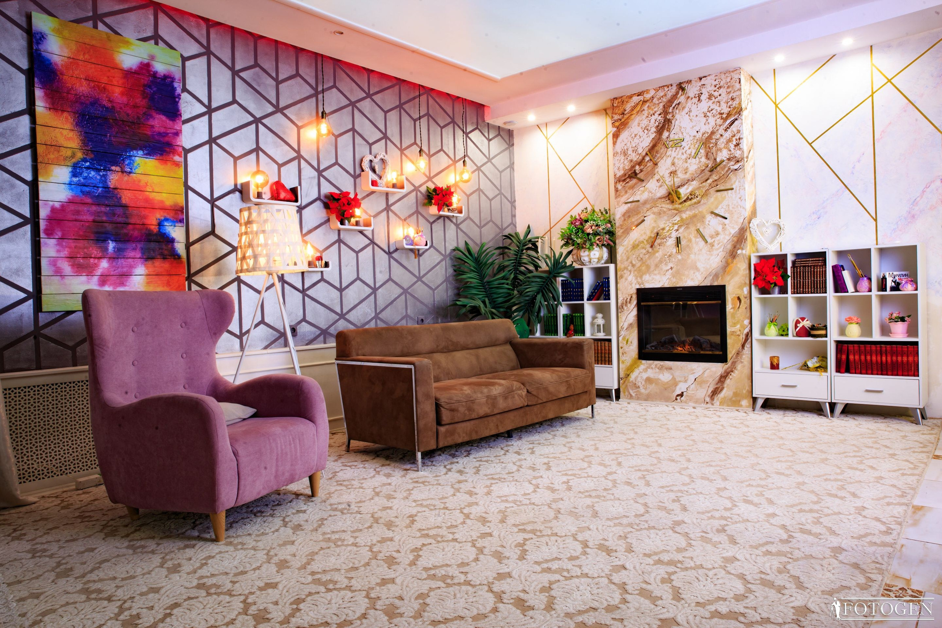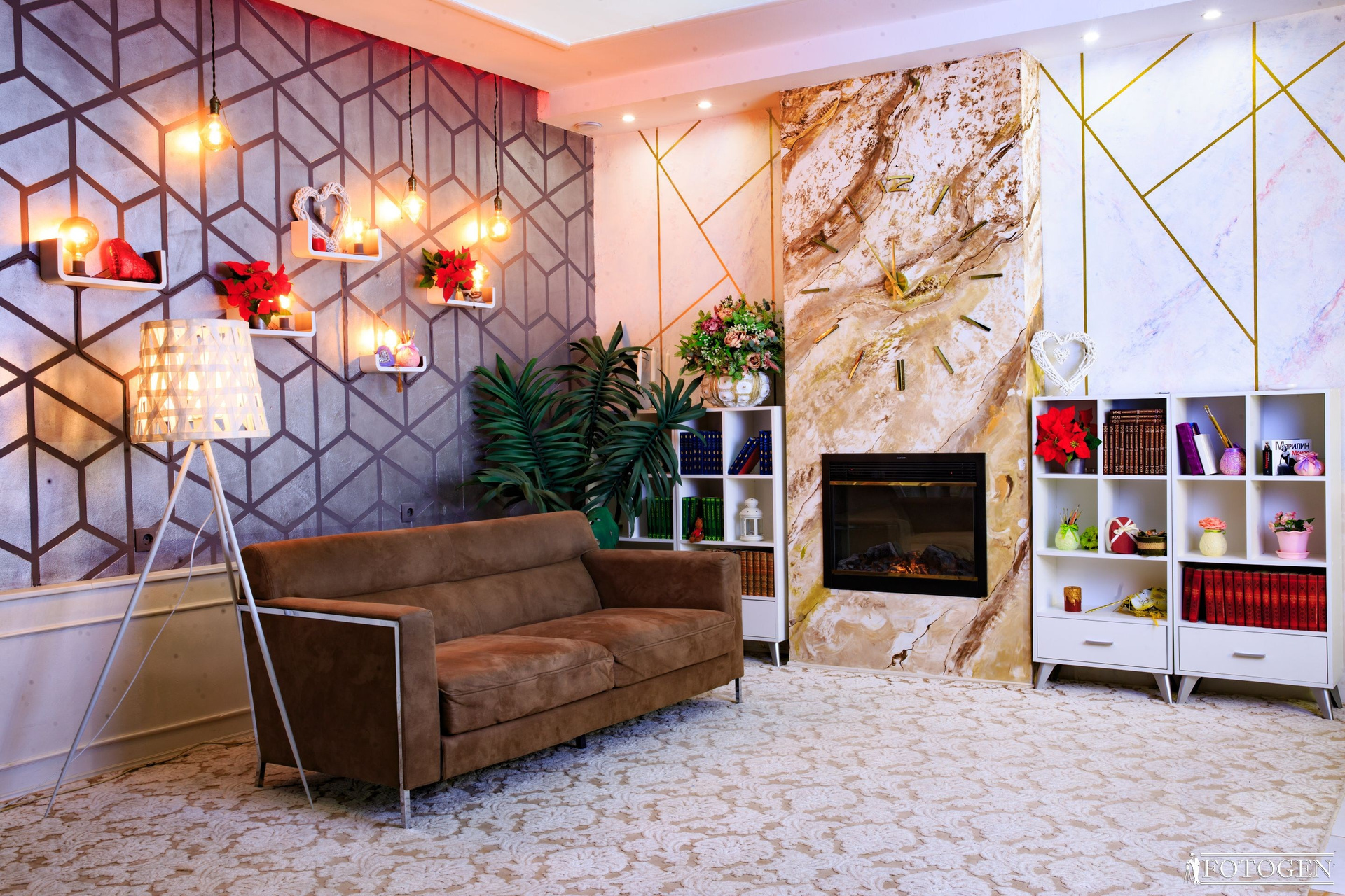 Уютная «Домашняя» локация в интерьерной фотостудии представляет собой настоящий уголок комфорта и стиля. Стальная 3D стена с огромной живописной картиной на натуральном дереве, выглядит потрясающе и привлекает внимание. Неоновая подсветка между потолком и стеной, с возможностью регулировать цвет, подчеркнет воссозданную вами атмосферу. Рядом с 3-х метровым камином, украшенным 3D часами, находится небольшая библиотека, которая подчеркивает домашнюю атмосферу.