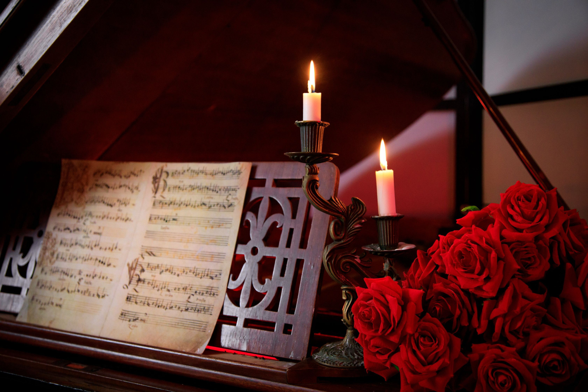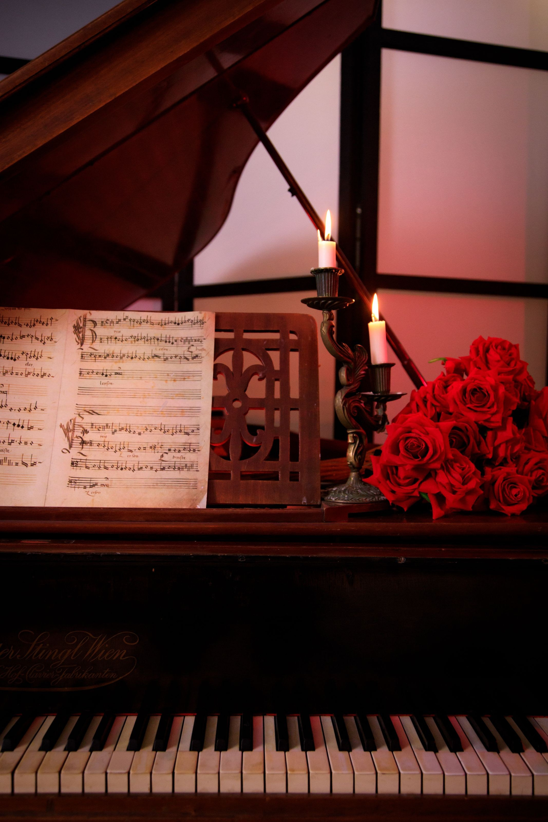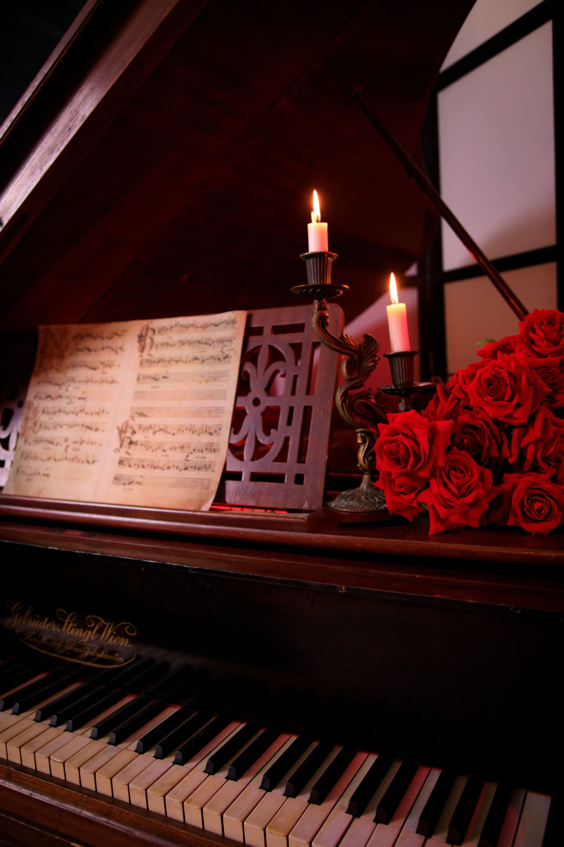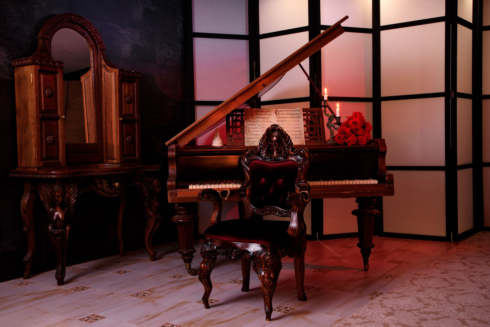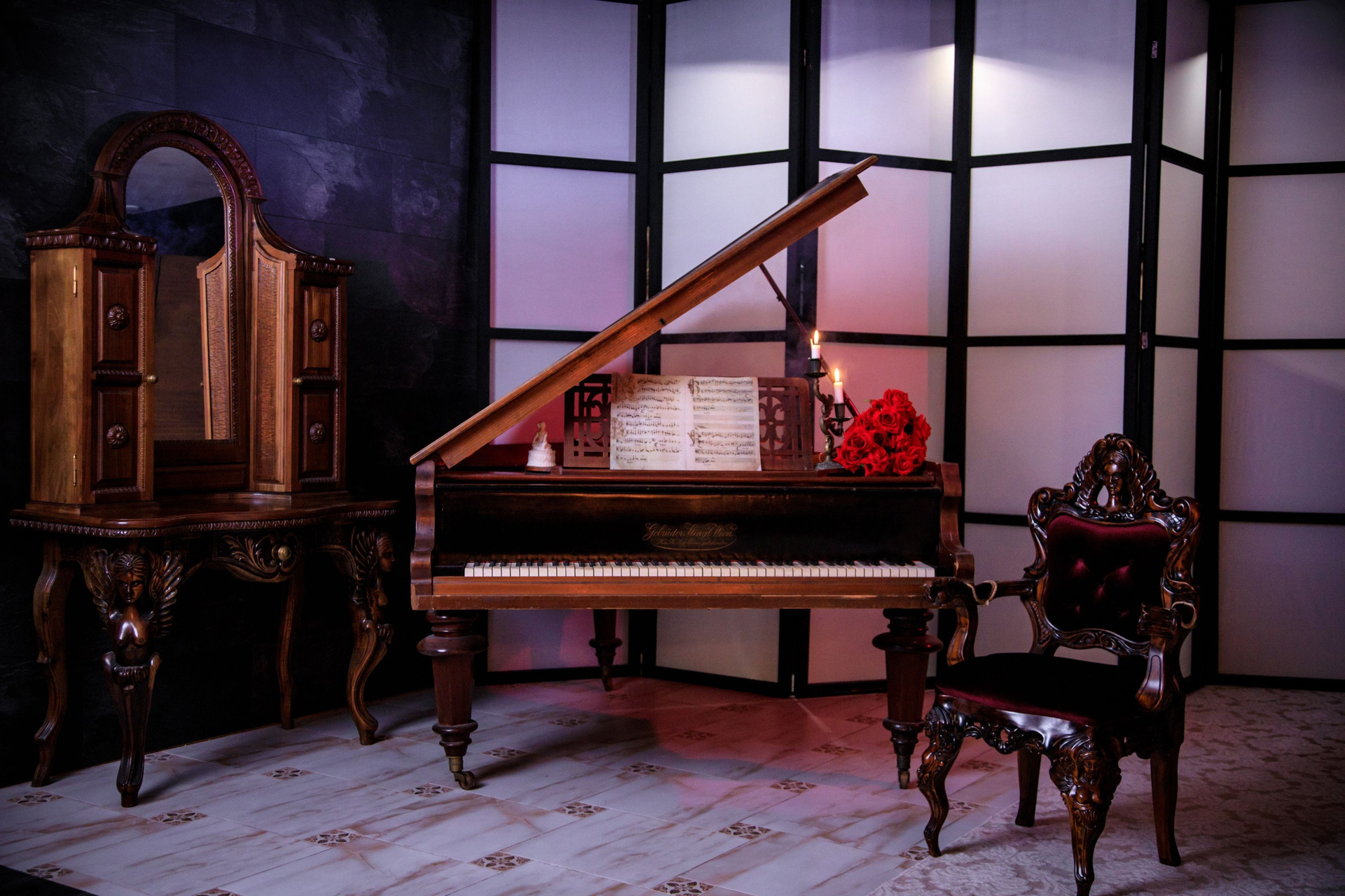 Великолепная локация «Старинный рояль» притягивает взгляды своим величественным австрийским роялем из красного дерева Gebruder Stingl Wien 1905 года, с клавишами из натуральной слоновой кости. Этот рояль — историческое произведение искусства, пюпитр с древними нотами, старинный бронзовый подсвечник несут свет и тепло, окружая рояль таинственной аурой. Каждая деталь этой фотозоны, начиная от королевского кресла, напоминающего трон, до резного туалетного стола с зеркалом, изготовленного из массива ореха, является воплощением искусства и благородства. В этом пространстве каждый миг наполнен утонченностью и несравненной гармонией.