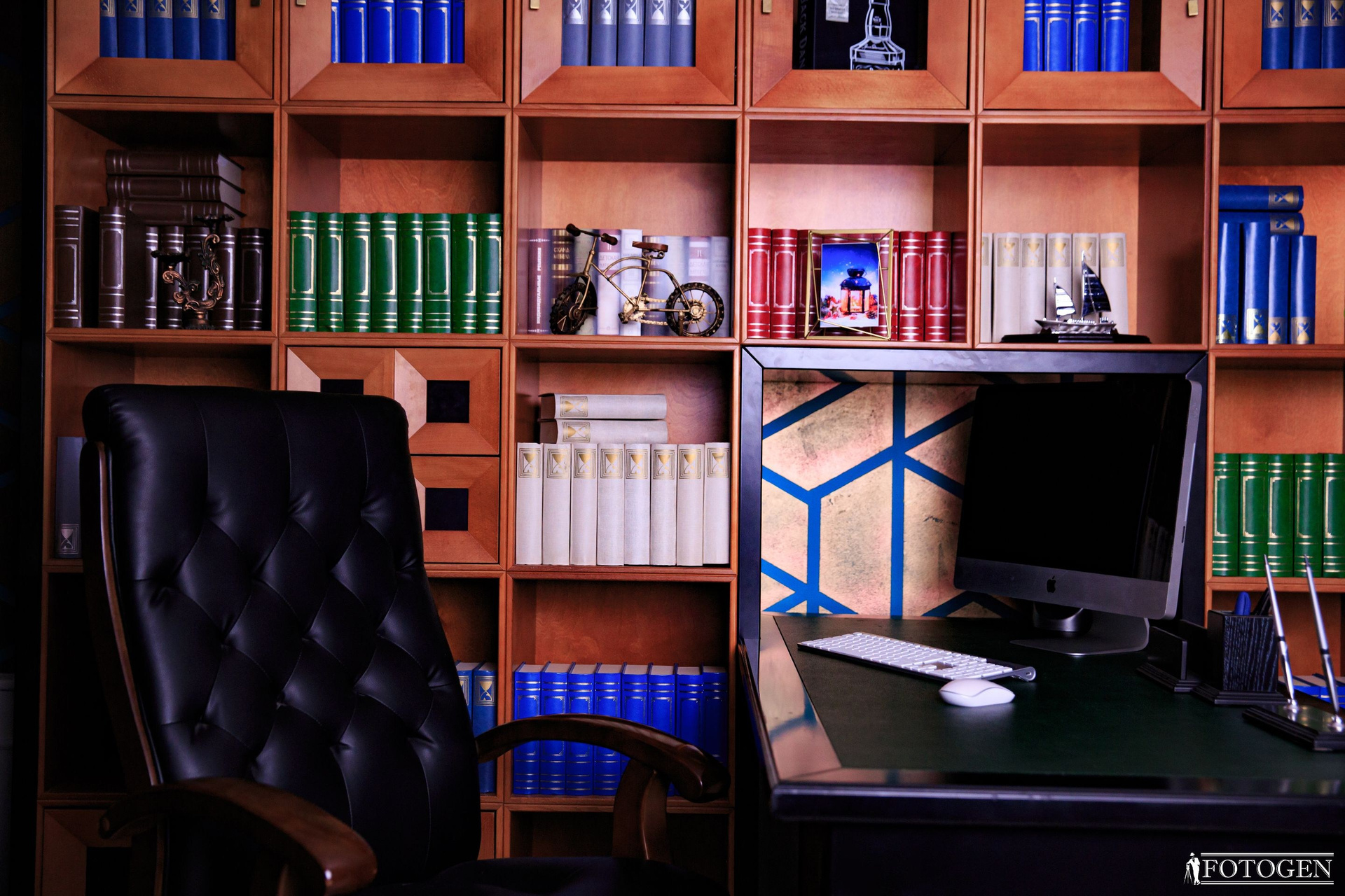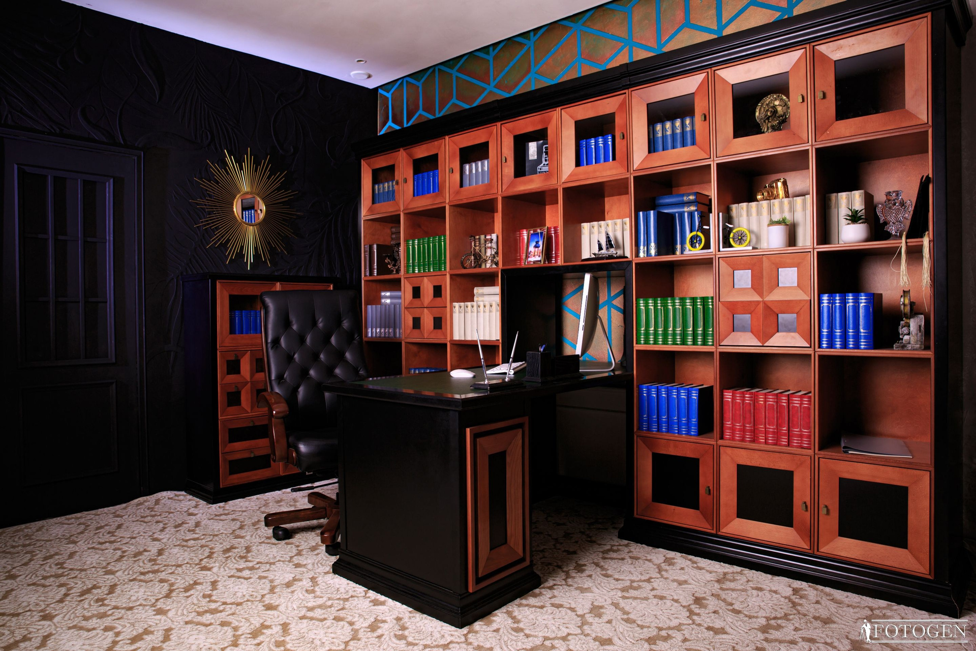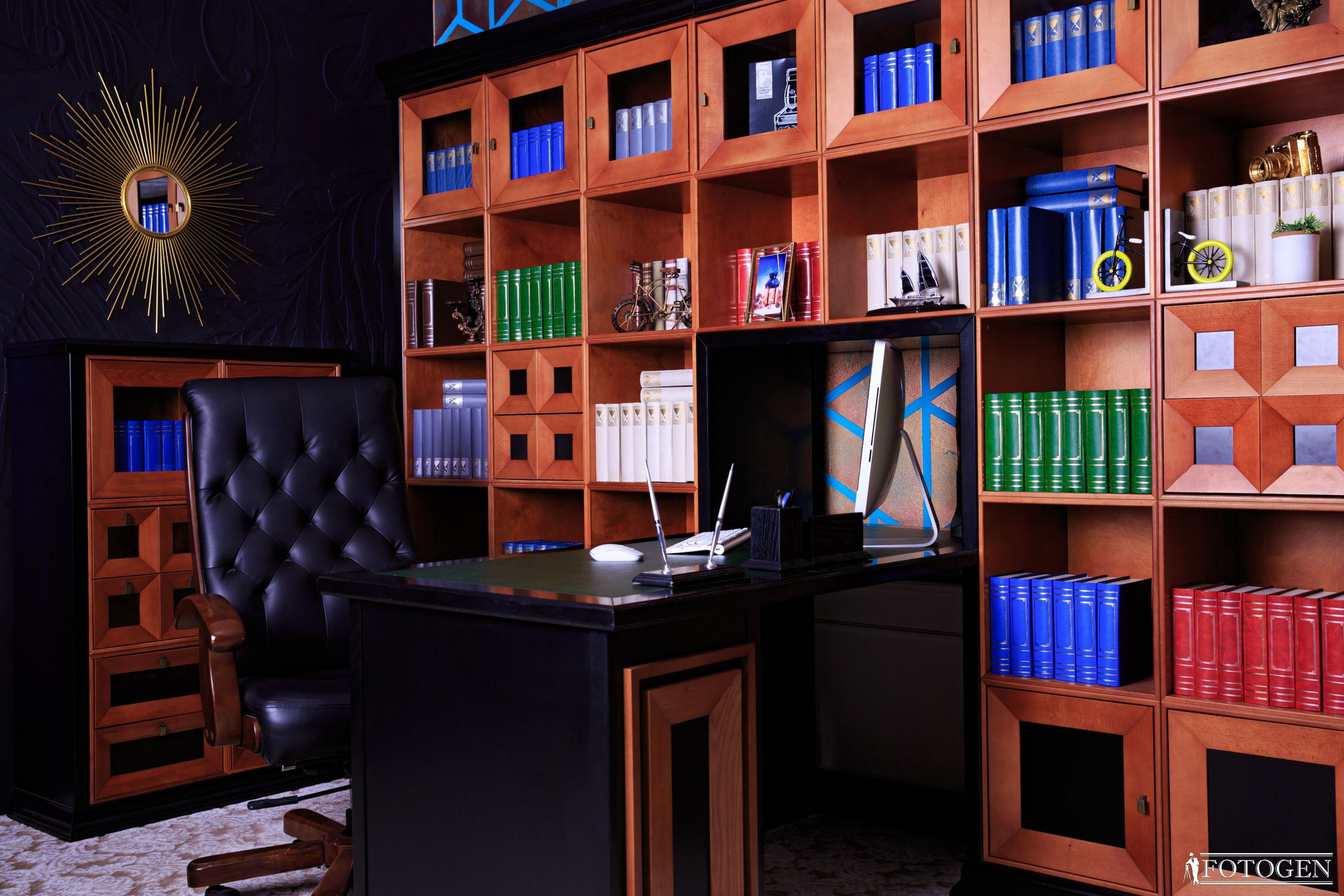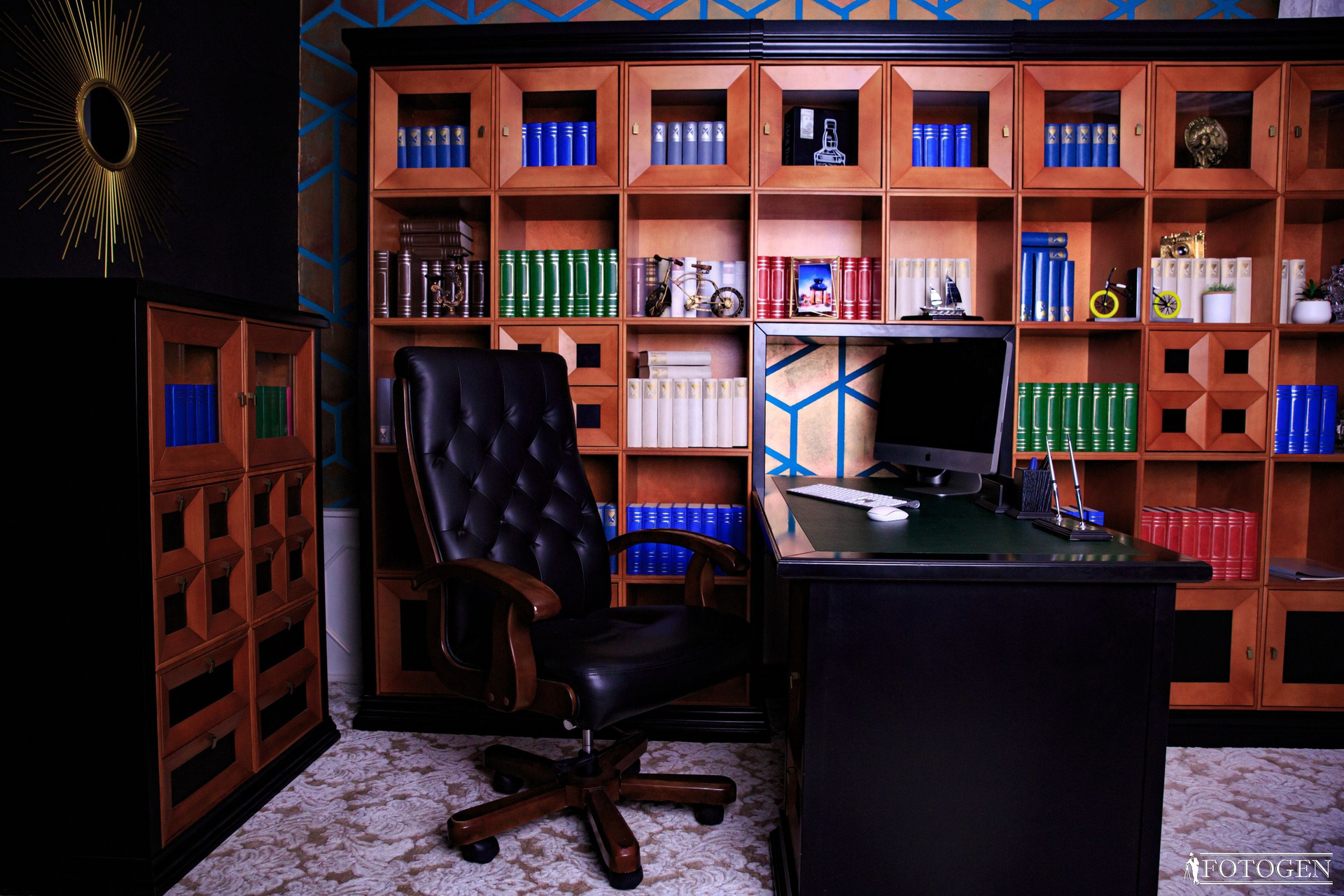 Погрузитесь в атмосферу стиля и элегантности в библиотеке из красного дерева — идеальном примере классического стиля, сочетающемся со строгостью кабинета руководителя. Шпон американской вишни, сбалансированные силуэты и текстура дерева подчеркивают естественную красоту фото, придавая ему презентабельный и внушительный вид. В этом пространстве также присутствует массивный стол обтянутой натуральной итальянской кожей, придающий этой локации благородную изысканность. Роскошное кресло, а также множество книг и реквизита, создают атмосферу интеллектуальности. Объемные стены добавляют утонченности и стиля, приглашая вас насладиться исключительной эстетикой и роскошью.