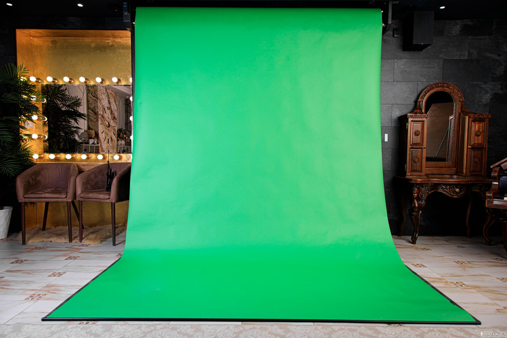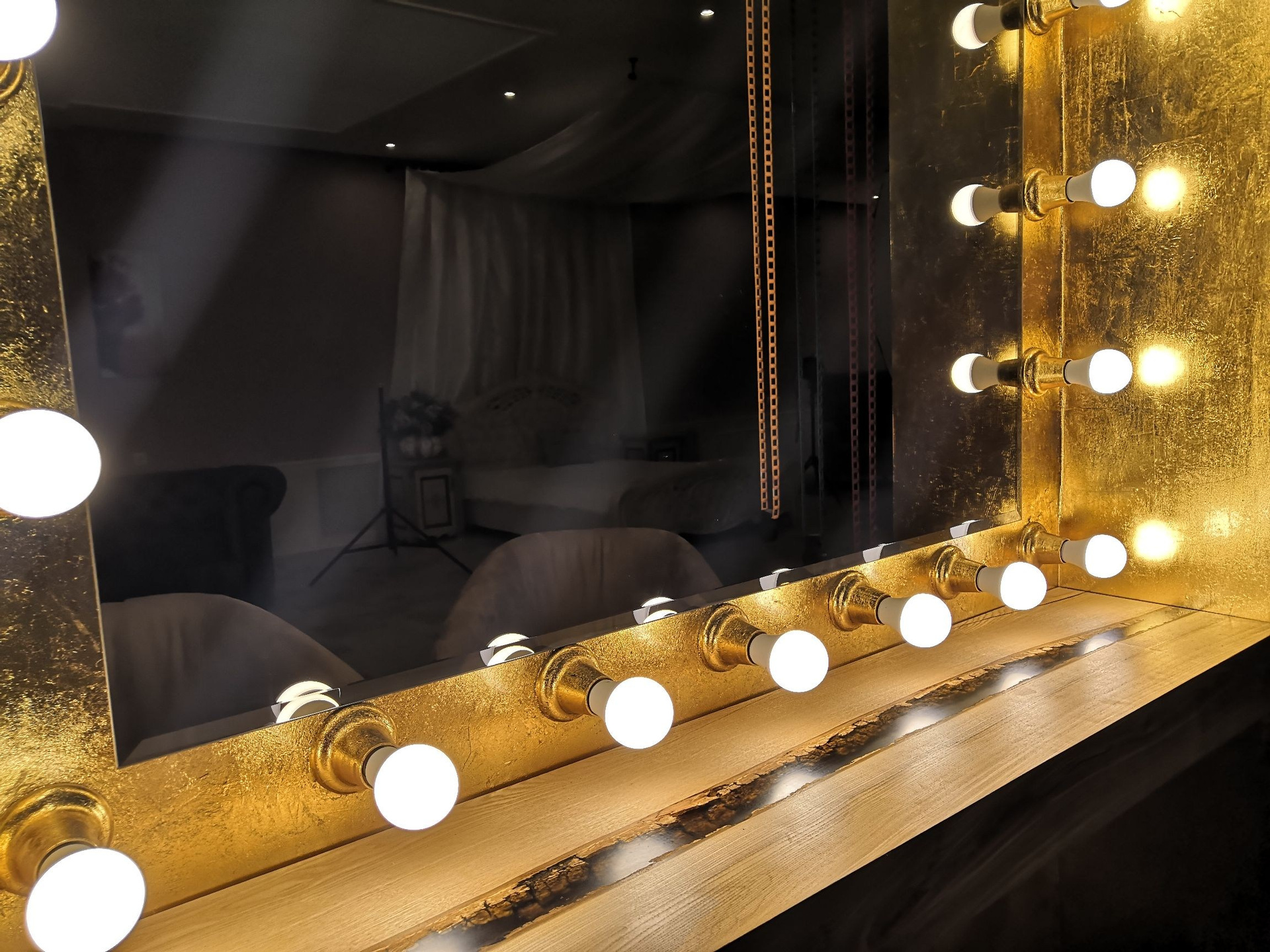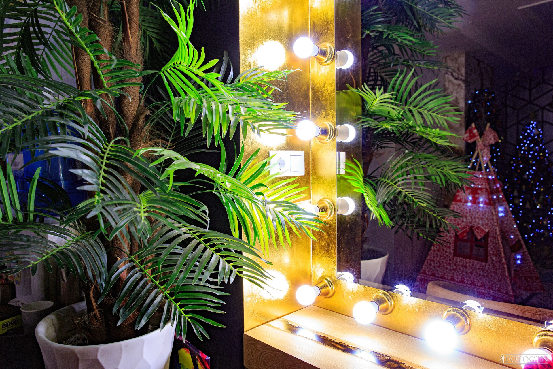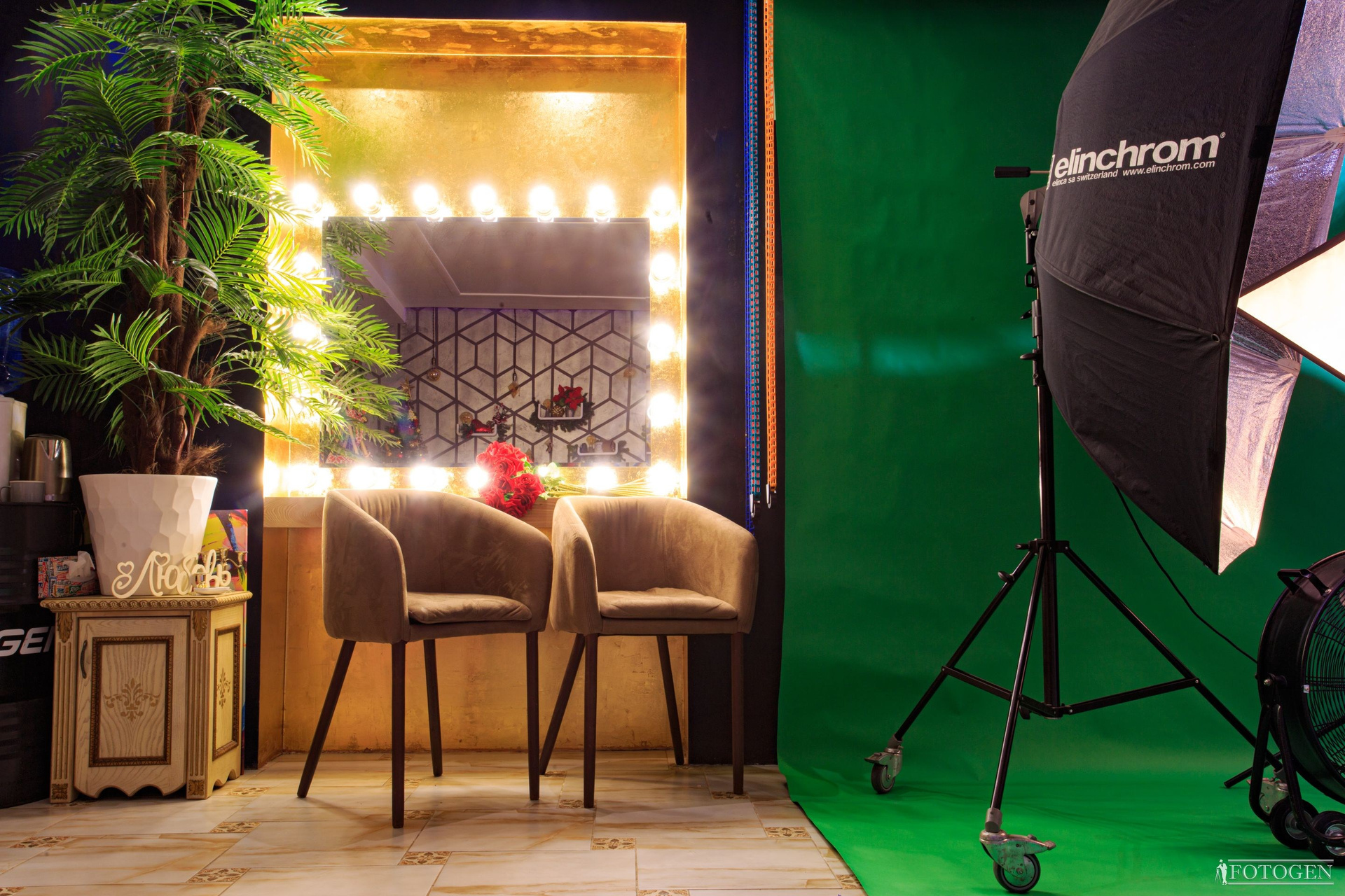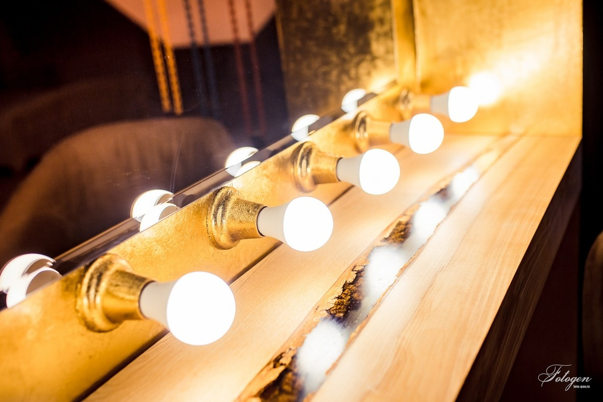 Восхитительная «Золотая Гримерка» в интерьерной фотостудии приковывает взгляды своим блеском сусального золота, создавая великолепное сочетание с огромным зеркалом, украшенным бронзовым эффектом и 20-ю яркими лампами, что создает уникальную атмосферу и эффектный световой акцент. Стол с деревянной столешницей из массива дерева придает интерьеру естественную красоту и теплоту, с ноткой природной элегантности. В центре столешницы проходит прозрачная река пепельного оттенка, придающая столу особую изюминку и создавая ощущение легкости и гармонии. Два дизайнерских кресла из замши идеально вписываются в интерьер, а большая пальма добавляет в кадр жизни. Так же у вас есть возможность подготовиться к фотосессии, сделав макияж и укладку самостоятельно или воспользовавшись услугами стилиста-визажиста у нас по приятной цене.