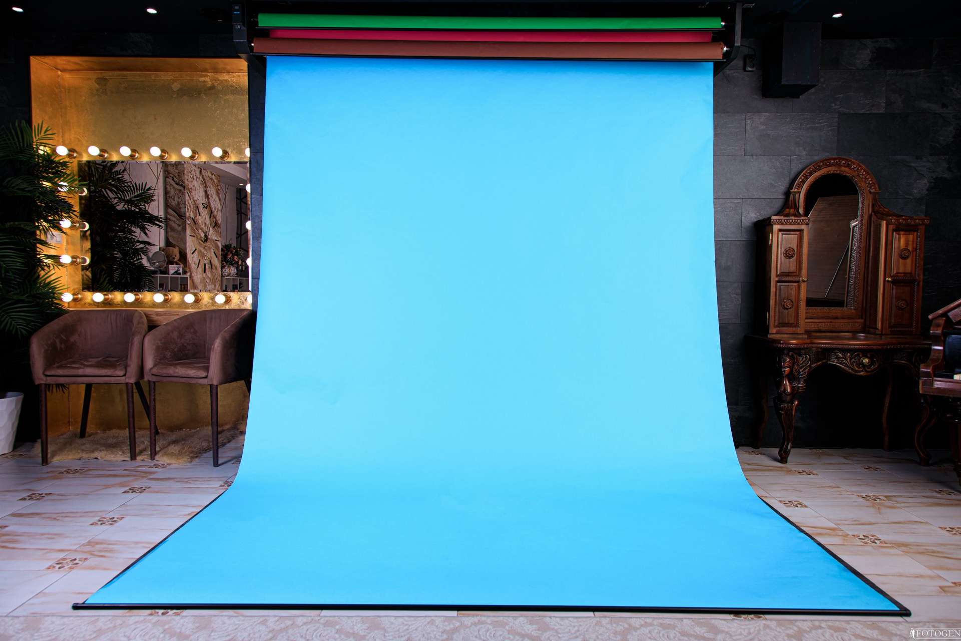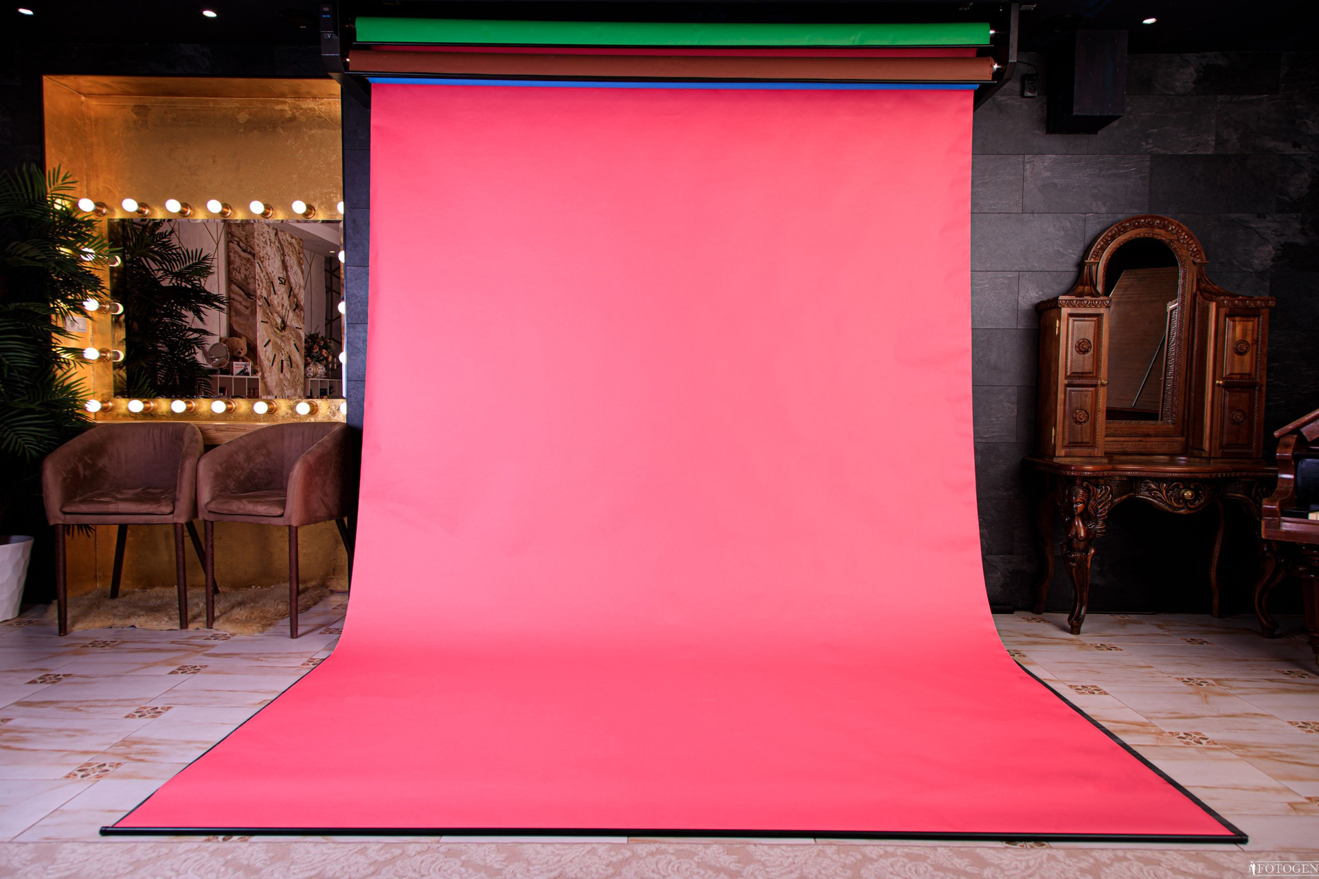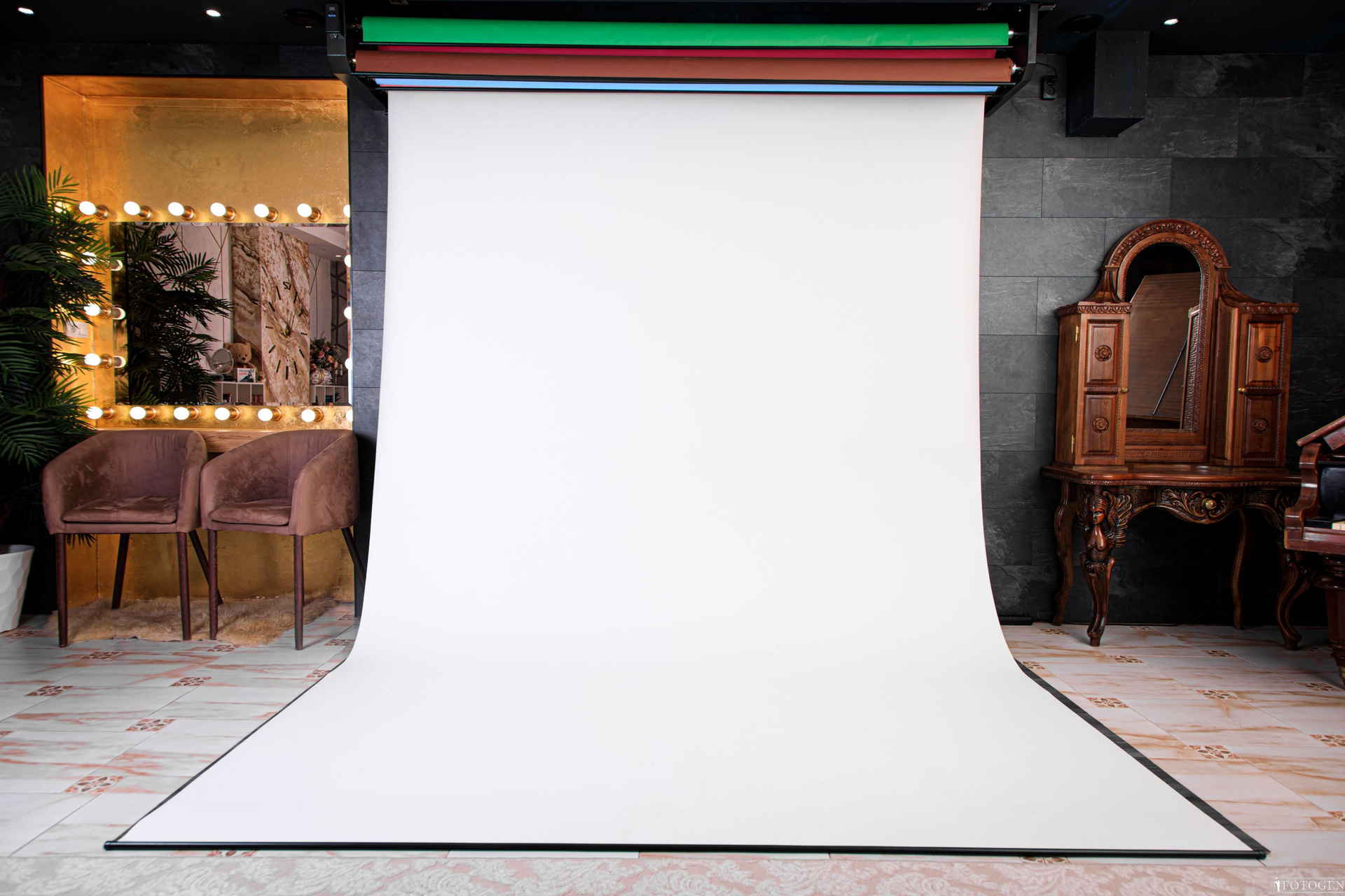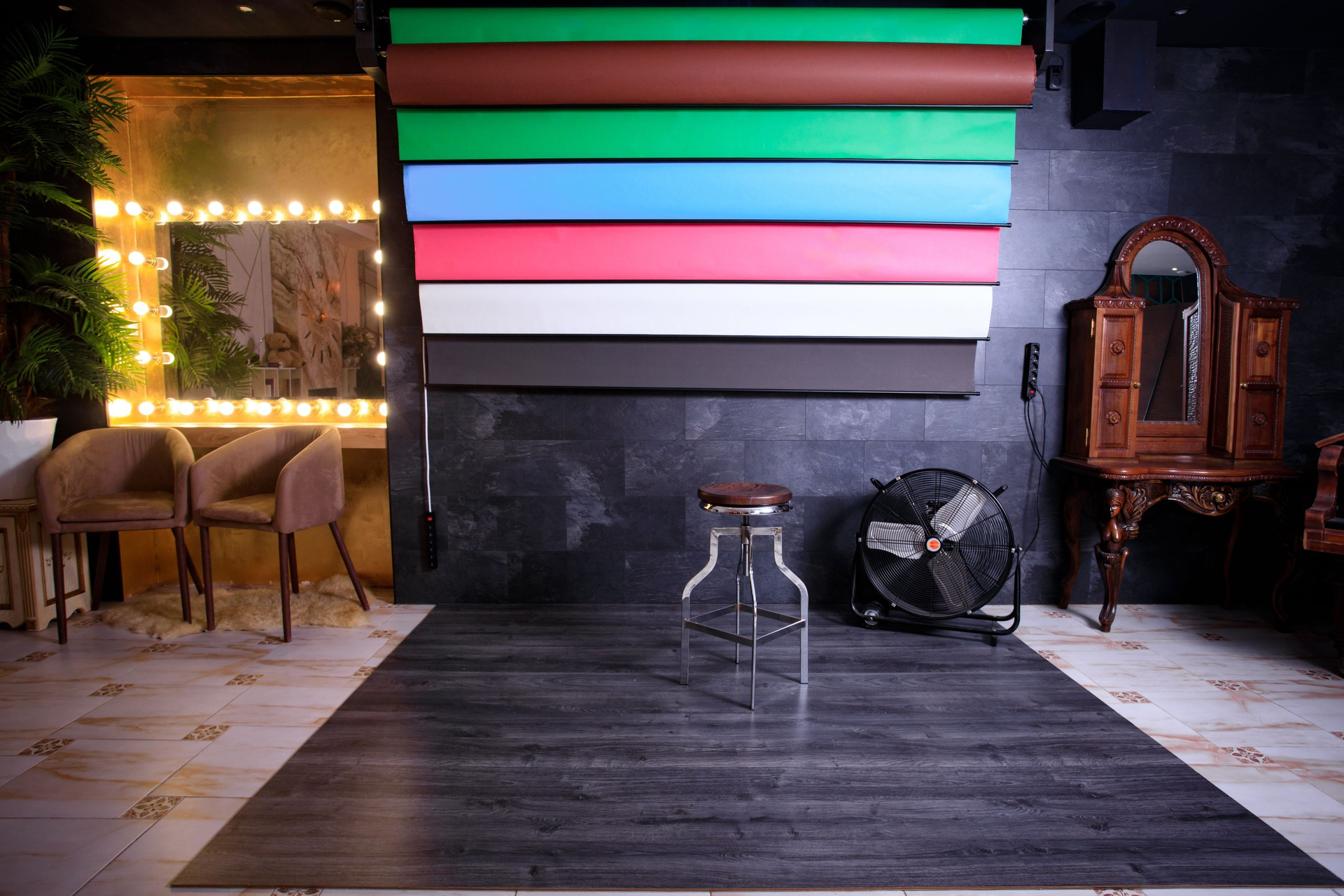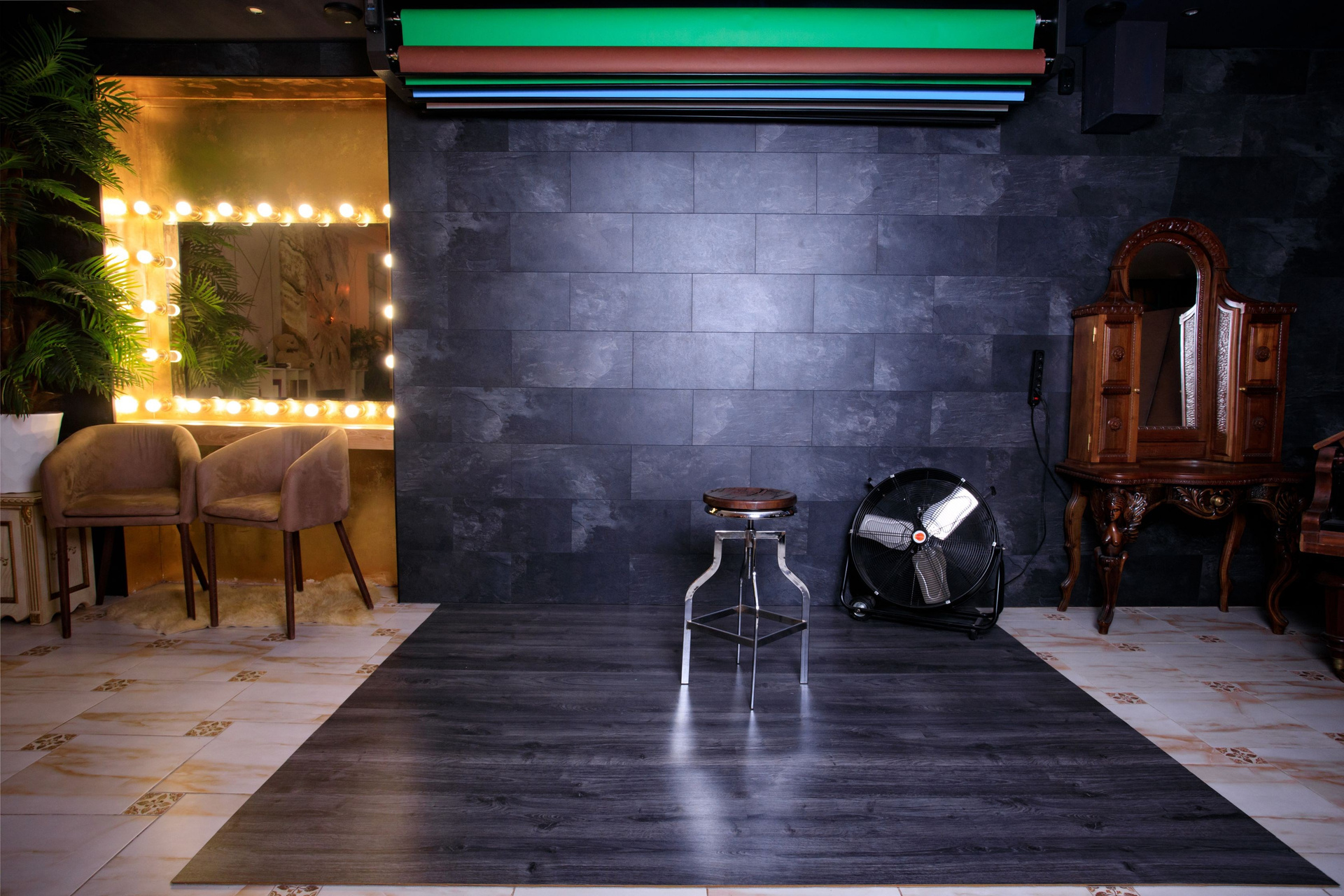 Декоративная стена и бумажные фоны разных цветов в интерьерной фотостудии предлагает вам уникальную возможность создать изысканные и элегантные снимки. Шикарные стеновые панели в оттенках темно-серого мрамора создают уникальный фон, подчеркивающий вашу красоту. Ламинат на полу добавляет пространству утонченности и стиля, создавая гармоничное сочетание элементов интерьера. Для вашего удобства в этой локации предусмотрено автоматическое развертывание бумажных фонов шириной 270 сантиметров в шести разнообразных цветах: коричневом, зеленом хромакее, голубом, розовом, белом и сером. Вы можете дать волю своему творчеству, экспериментировать с образами и создавать уникальные фотографии, которые запомнятся надолго. Ощутите вдохновение и эстетику в этом восхитительном пространстве!