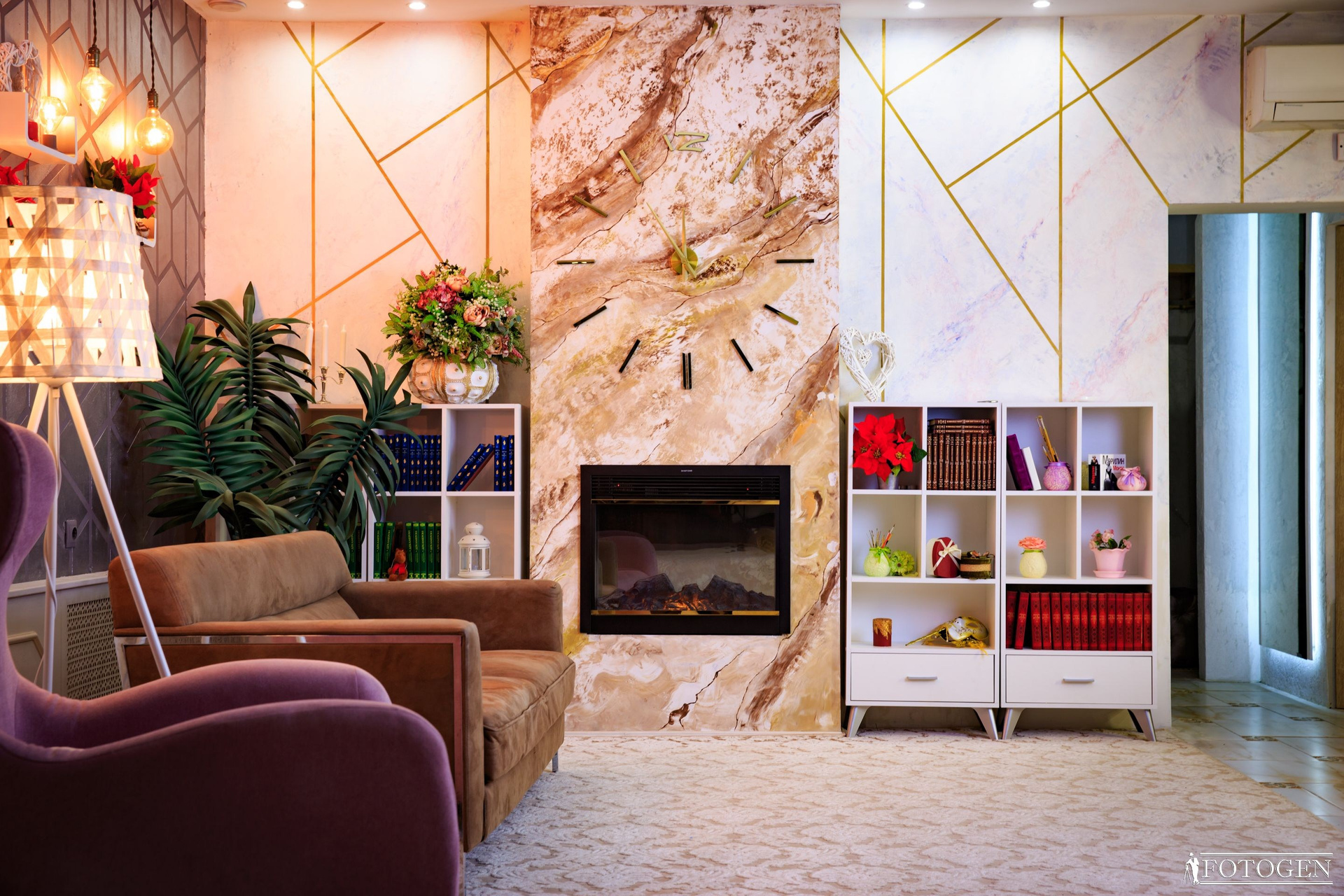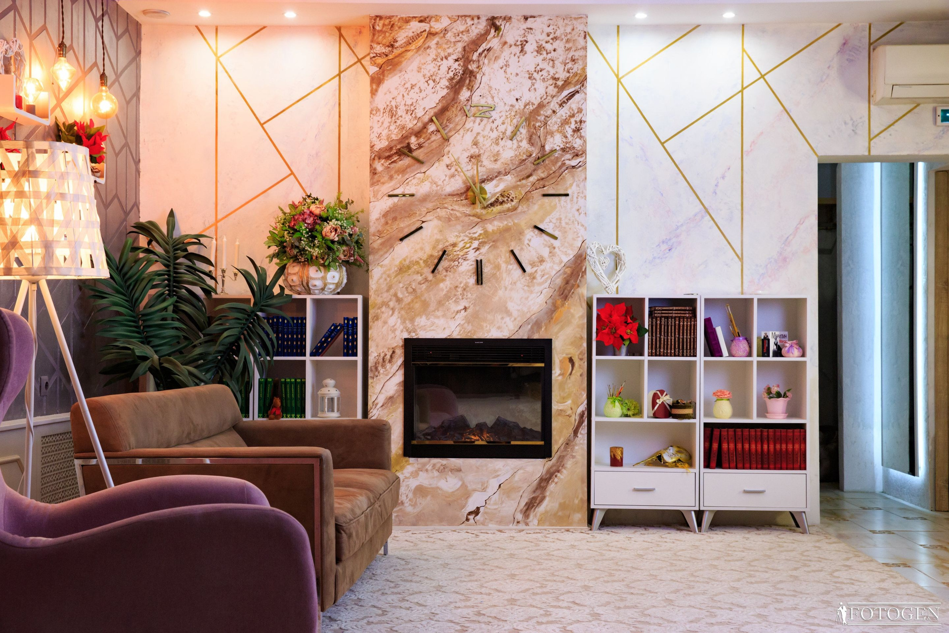 Дизайнерская отделка стен венецианской штукатуркой в стиле Итальянского мрамора, украшенная серебром, придаёт интерьеру особый шарм. Стильная мебель, множество аксессуаров, эта локация идеально подойдет для создания уютных и запоминающихся фотографий, погрузившись в атмосферу комфорта.