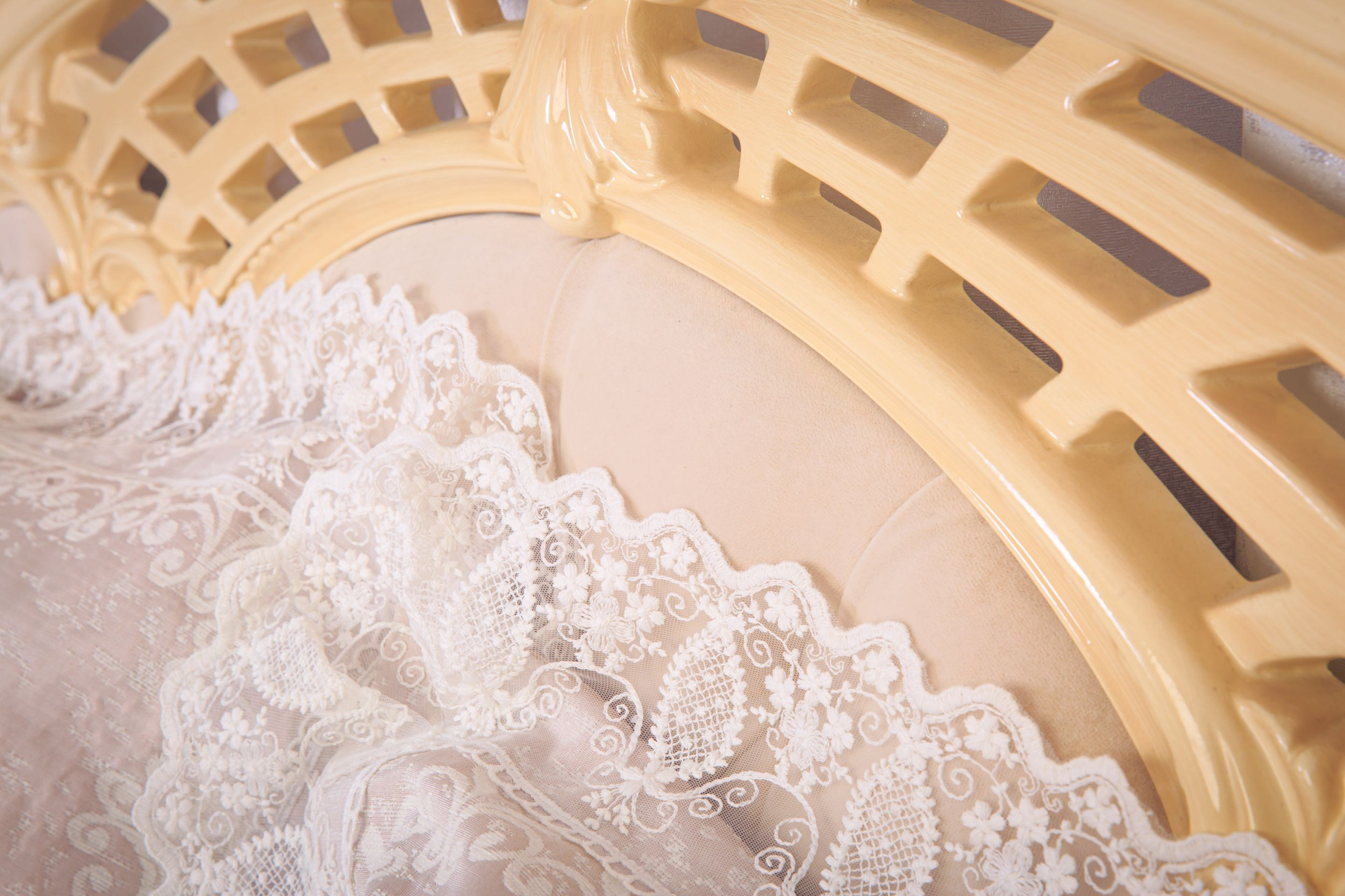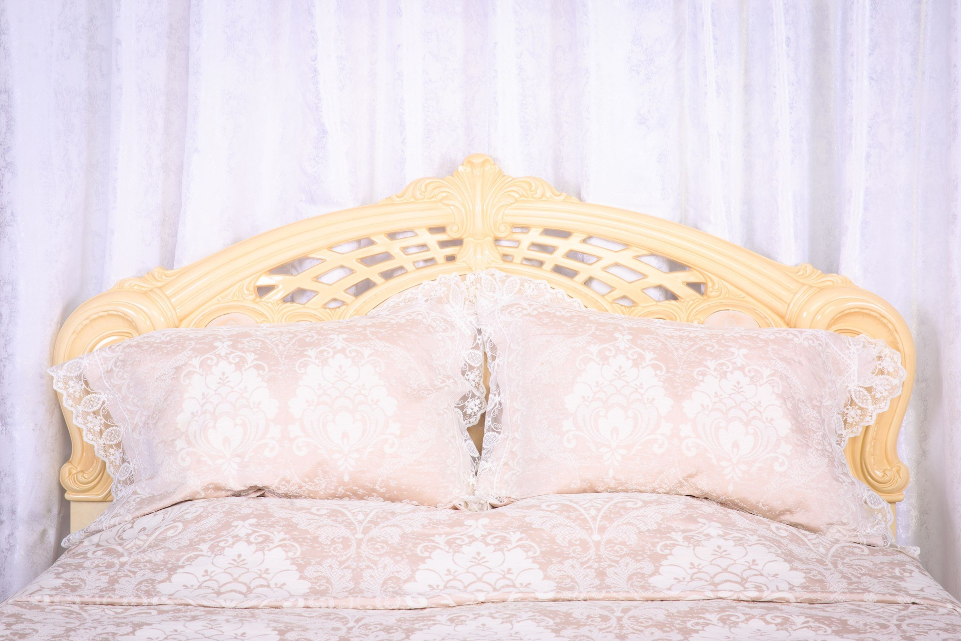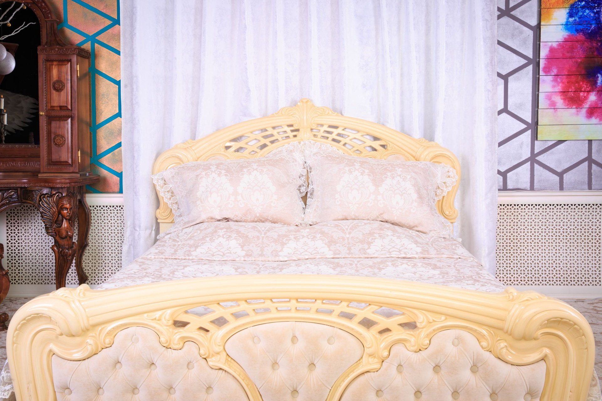 Роскошная «Спальная зона» представляет собой итальянскую кровать, украшенную изящным витиеватым декором. Бархатная обивка и каретная стяжка на изголовье создают впечатление королевского ложа. Над изголовьем и по всему потолку расположен тканевый балдахин, а гобеленное покрывало с ажурным обрамлением добавляет шарма этой локации.